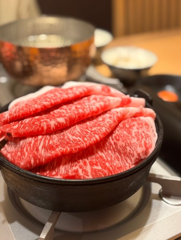 店內午間推出每日限量 20 份的「國產和牛壽喜燒午餐」,價格為 1,980 日圓。於大阪觀光區能以此價位享用現點現切的國產和牛,性價比相當突出。