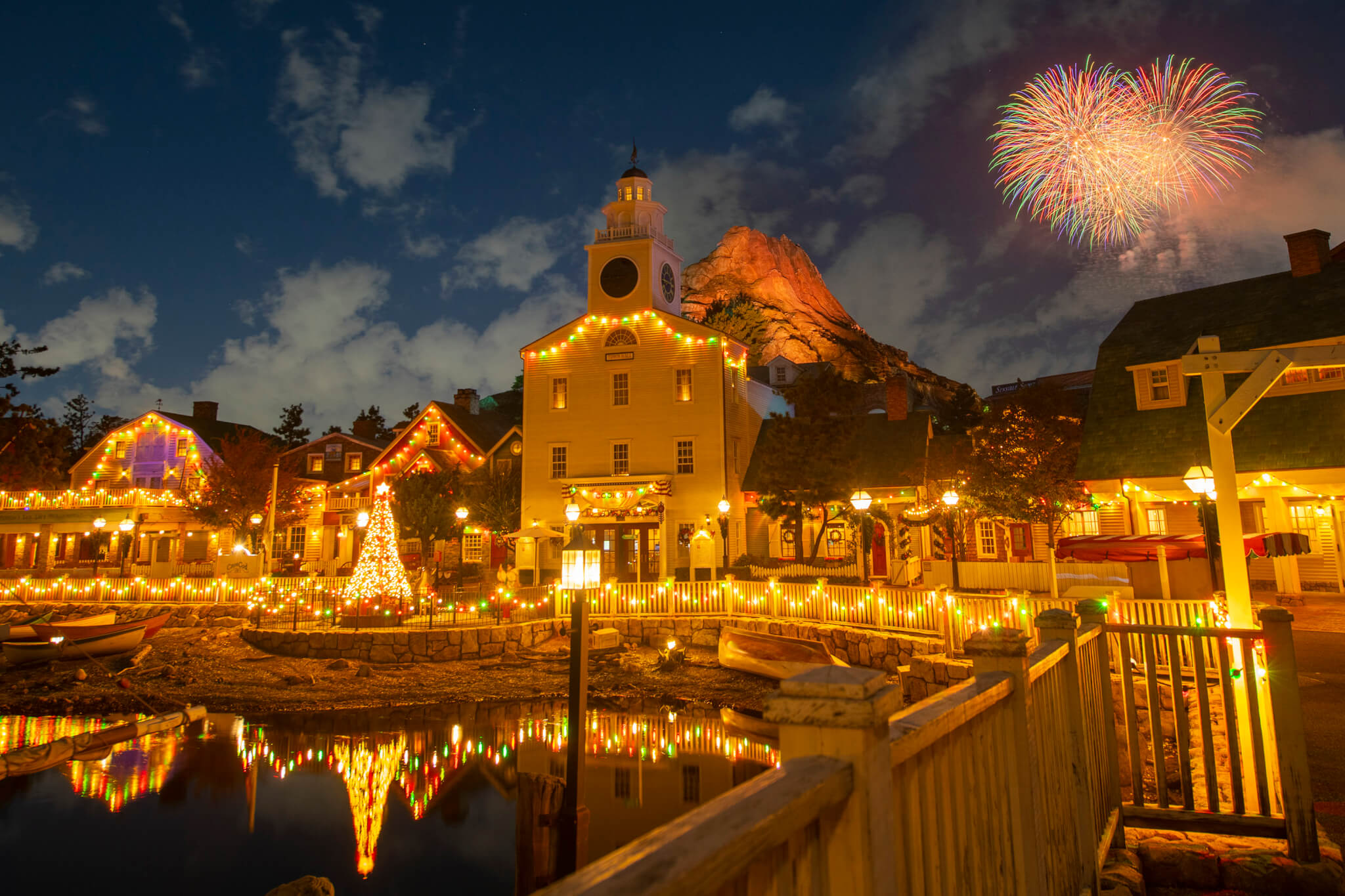 伴隨聖誕樂聲,朵朵盛開的燦爛煙火宛如閃耀的明星高掛園區夜空。