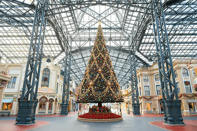 樂園入口與「世界市集(World Bazaar/ ワールドバザール )」布滿閃爍燈飾,中央高聳的聖誕樹是必拍打卡點。